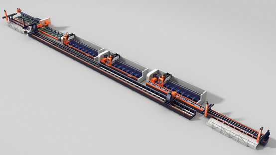 OYT全自動多工位柔性智能生產線是歐亞特創新理念、技術和裝備的集大成之作,雙頭任意角度切割、加工中心鉆銑、機械臂輸送及上下料等多功能自動化于一體,對于常規幕墻立柱類型材的加工速度可以達到100秒一根成品,具備條碼打印并可接入MES系統,絕對是當下門窗幕墻類企業降本增效提質的“黑科技”。